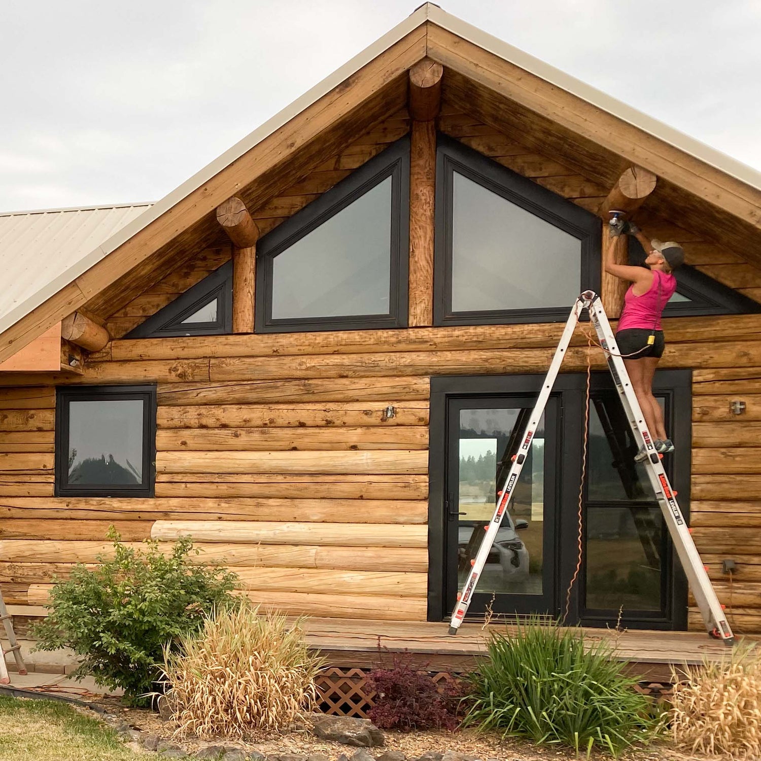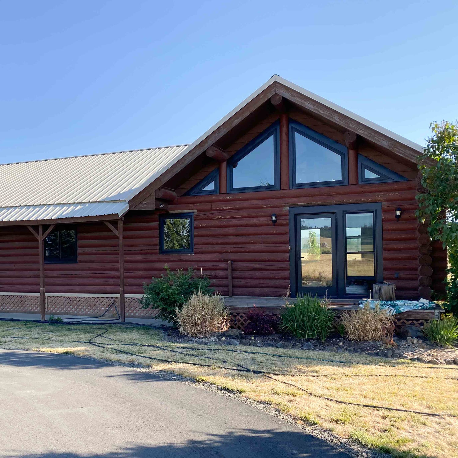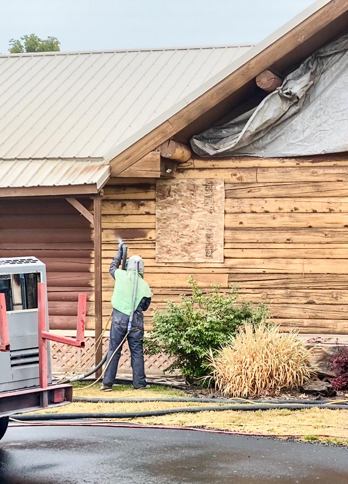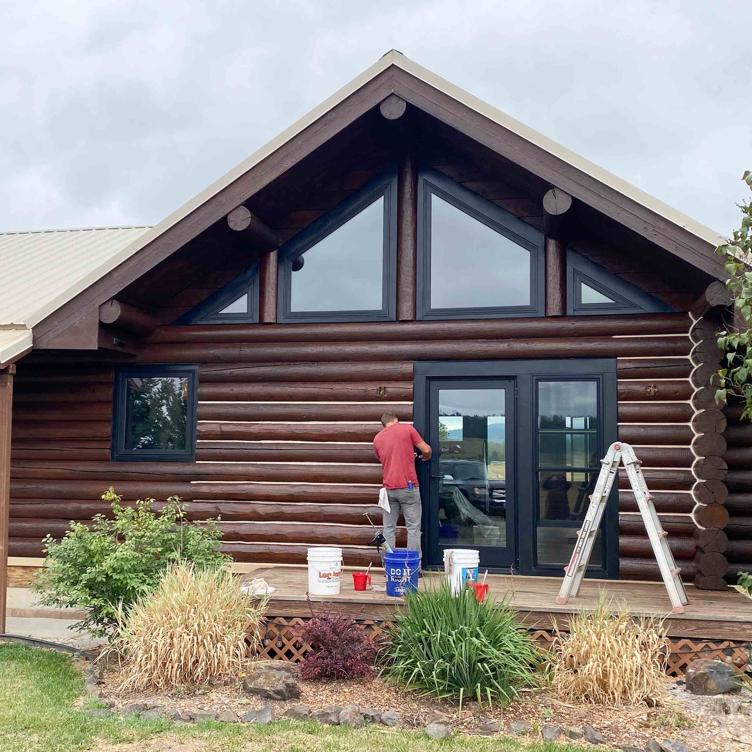 There were portions of this home that required hand sanding around window trim and round logs. These customers had just replaced their windows which required the team to take extra steps to protect them during the project. You can also see replaced half logs to the left of the front door.