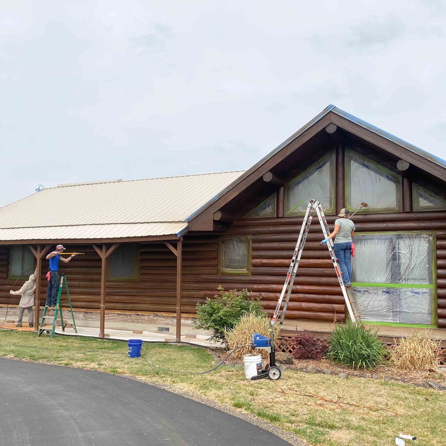 This log home project involved media blasting the exterior to remove paint on the logs. We also removed dry rot half logs and replaced with new half logs. We filled any exterior cracks in the logs that can often be a bug super highway or can allow for dry rot to begin. Towards the end of the project we stained the exterior and applied all new chinking.