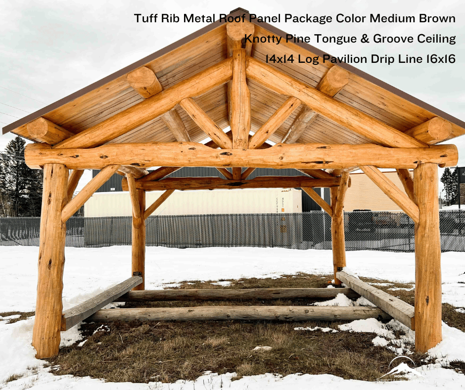 Constructed with precision and care, each pavilion boasts robust log frames that promise longevity and sturdiness. The tongue and groove Knotty Pine ceiling adds a touch of rustic charm, inviting you to relax and unwind under its beauty. Protected by a Tuff Rib Metal Roof Panel Package from Miramac Metals, these pavilions are not only aesthetically pleasing but also engineered to withstand the elements, ensuring your outdoor sanctuary remains pristine for years to come.