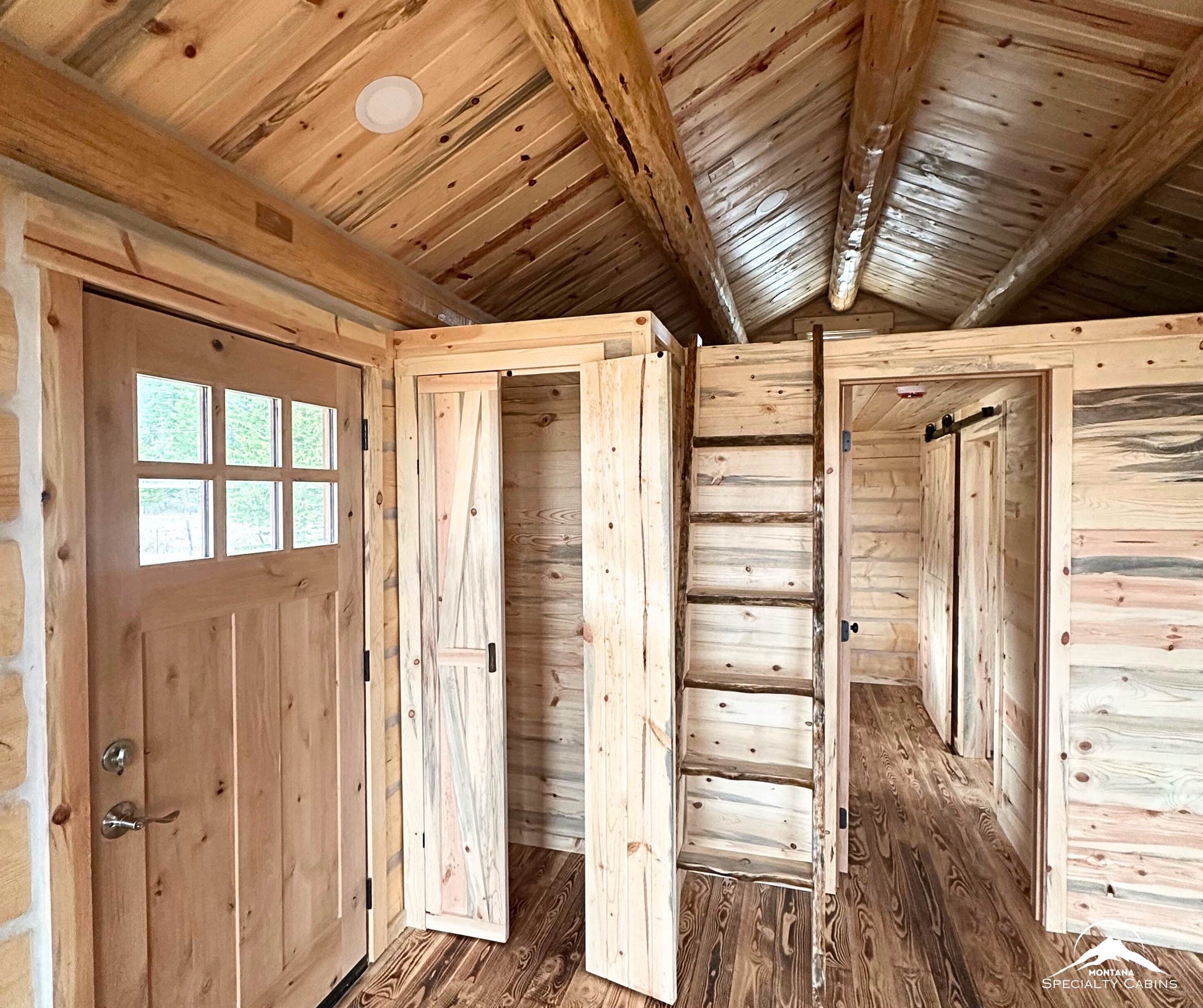 What sets this model apart? Custom trapezoid windows flood the space with natural light, framing the outdoors like living art. Inside, a stunning tongue and groove knotty pine ceiling draws the eye upward to the 11-foot interior peak. The 12x12 loft adds a spacious second level perfect for sleeping, storage, or a private nook.