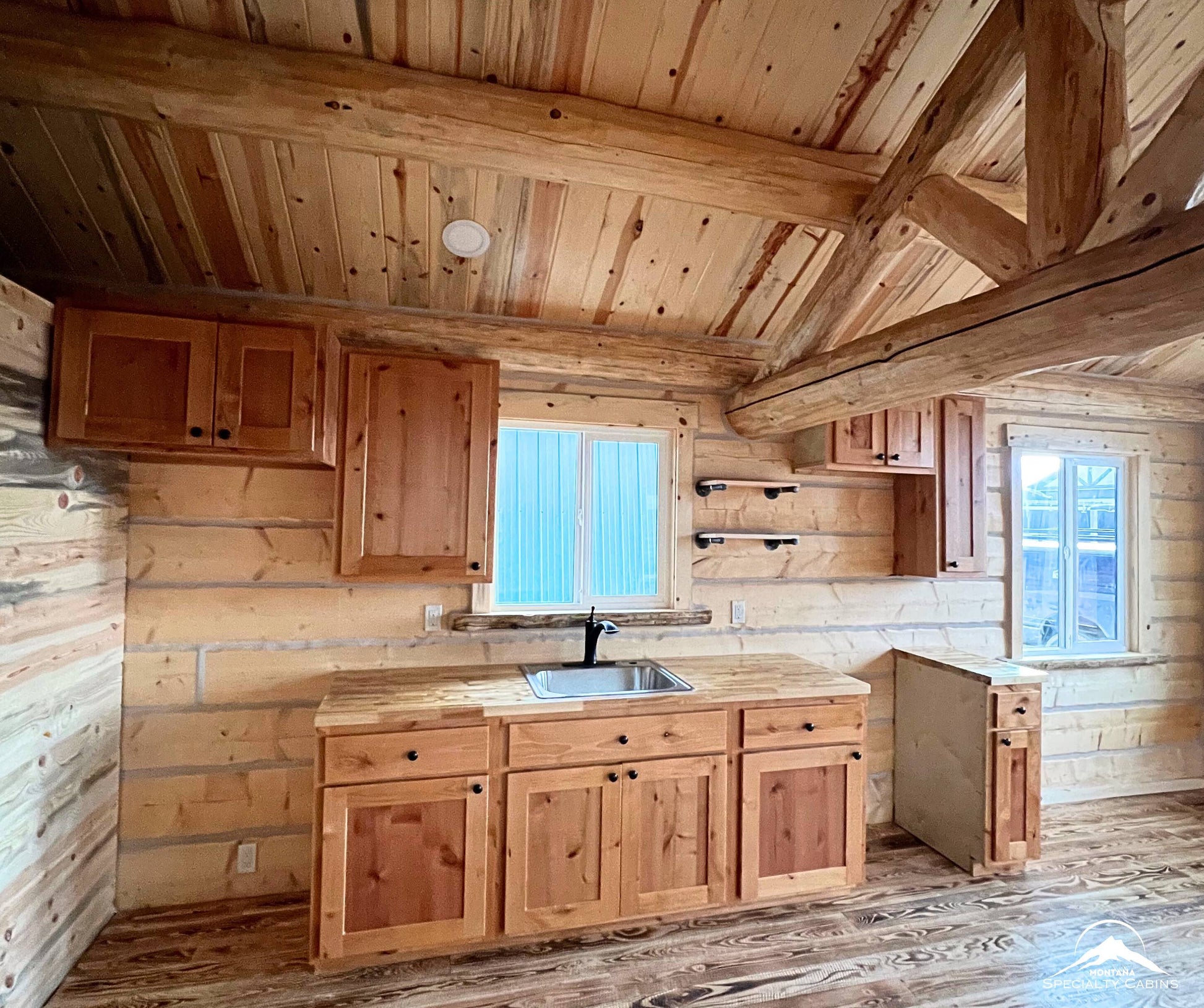 Underfoot, you’ll find hand-burnt circular sawn Douglas Fir flooring—custom-made by Montana Specialty Log Construction for authentic character and warmth. The black exterior window frames pop beautifully against the Chestnut-stained logs and rich dark brown chinking, while the interior shines with a clear gloss finish and warm buff chinking.