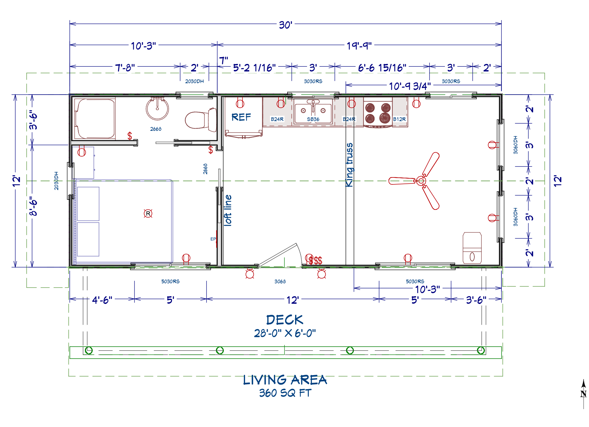 Cabin Dimensions: 12’ wide x 30’ long, 7’ wall height, interior peak height 11’